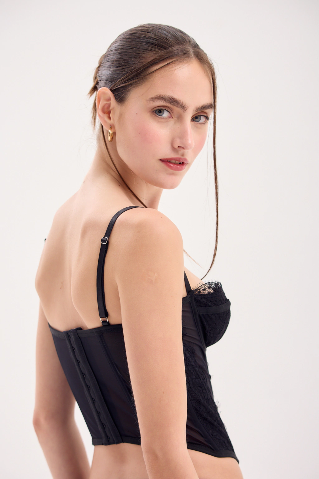 El Corset Sienna combina la textura aterciopelada, la puntilla, con las transparencia del microtul. Lleva ballenas de refuerzo forradas que brinda estructura y buen soporte. Tiene breteles regulables. Su espalda posee tres hileras de ganchitos para poder ajustastarlo según necesidad.