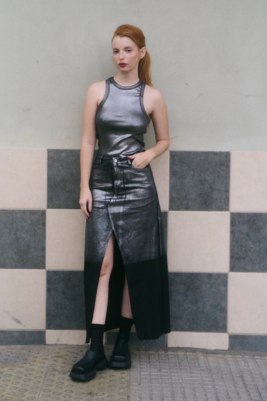 Falda midi de jean color negro, con detalle en foil color plata en la parte superior.